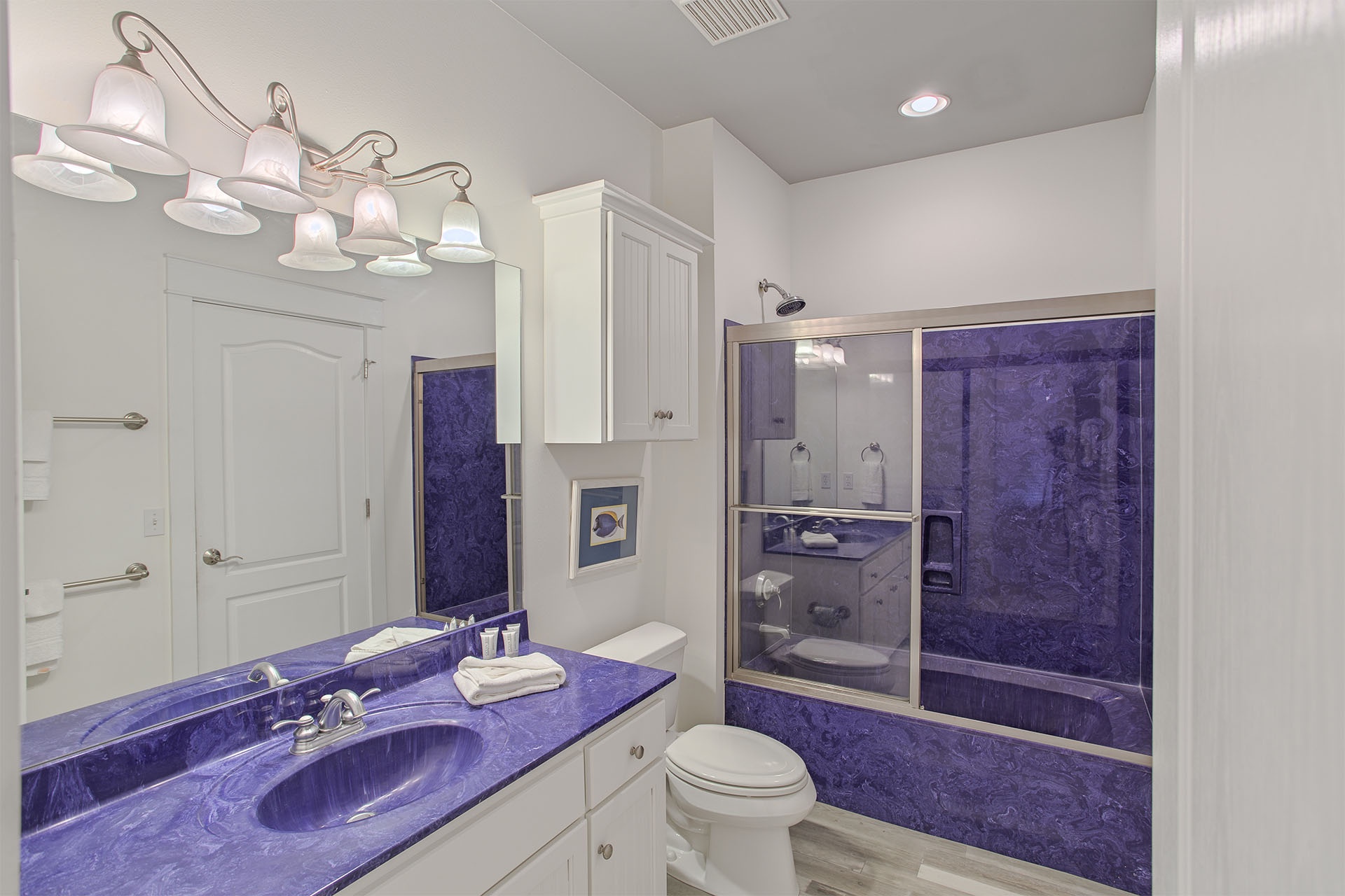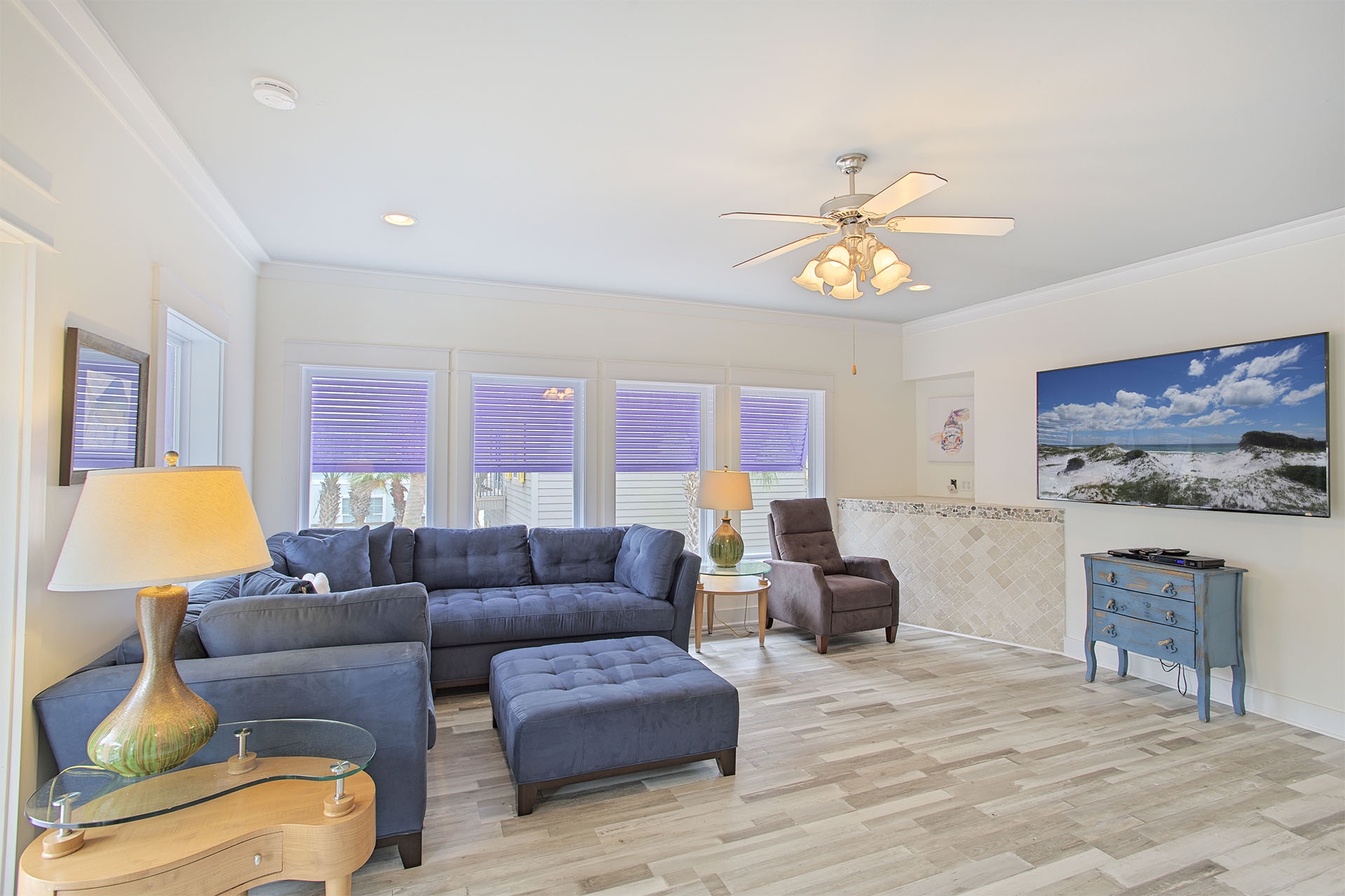 Upstairs at Under the Sea are the three other Guest Suites, each of which are individually decorated in their own wonderfully unique styles. Each has access to their full bathroom, one of which doubles as a powder room. Breezy covered balconies look down onto the pool below. The main living area is also on the second floor, which has a 75-inch flat-screen Smart TV and plush comfortable furnishings convenient to the upstairs bedroom suites.