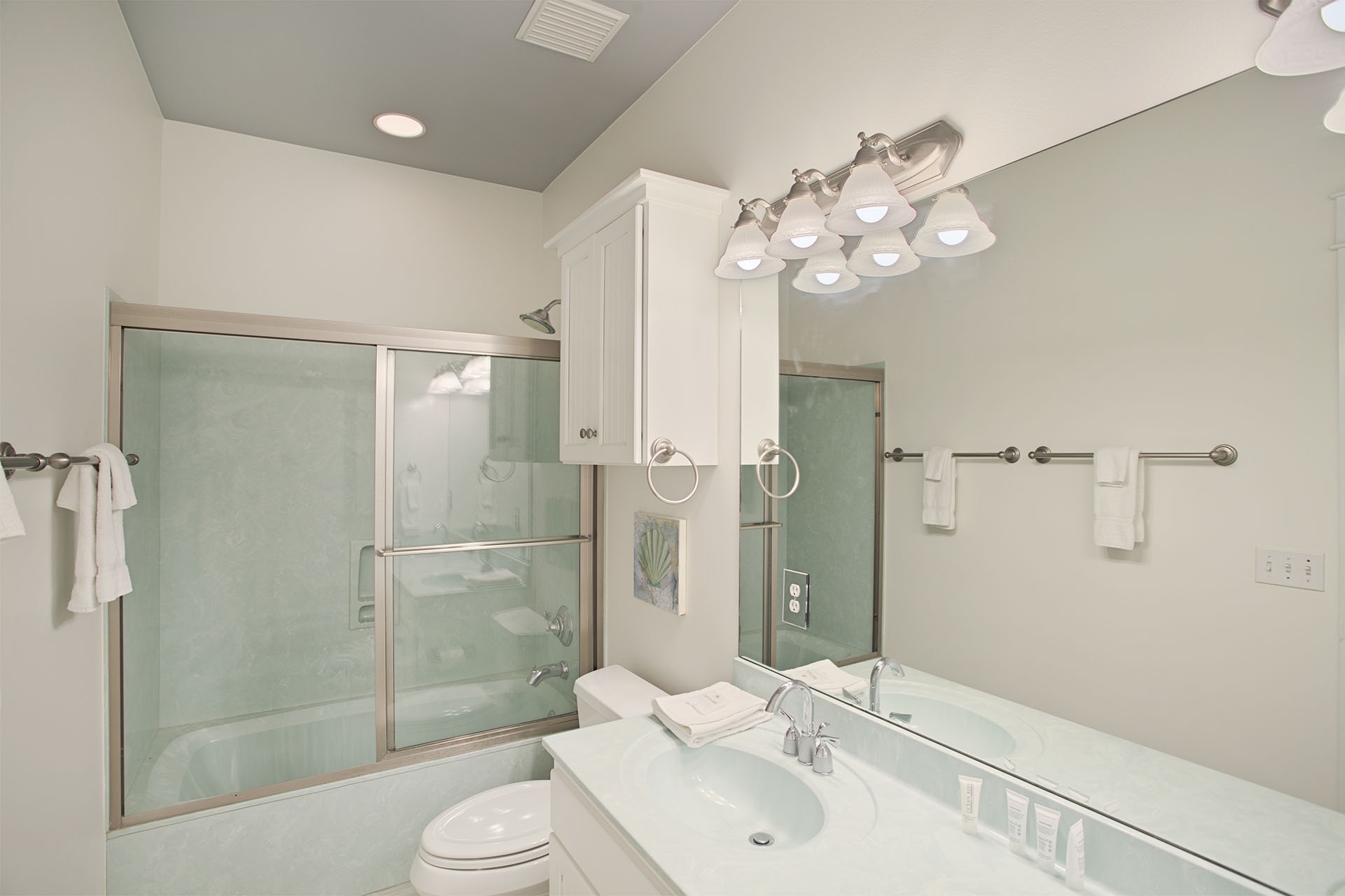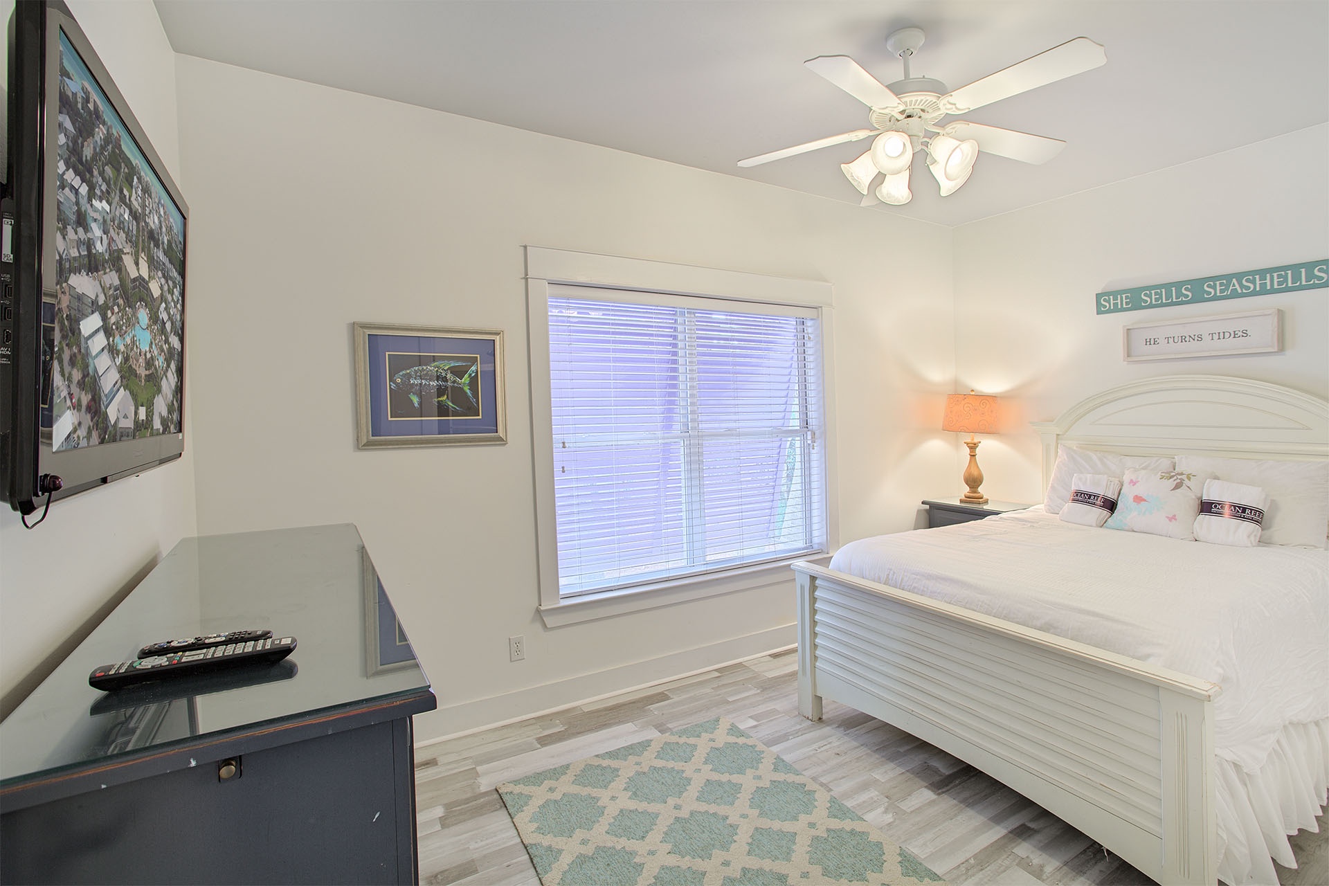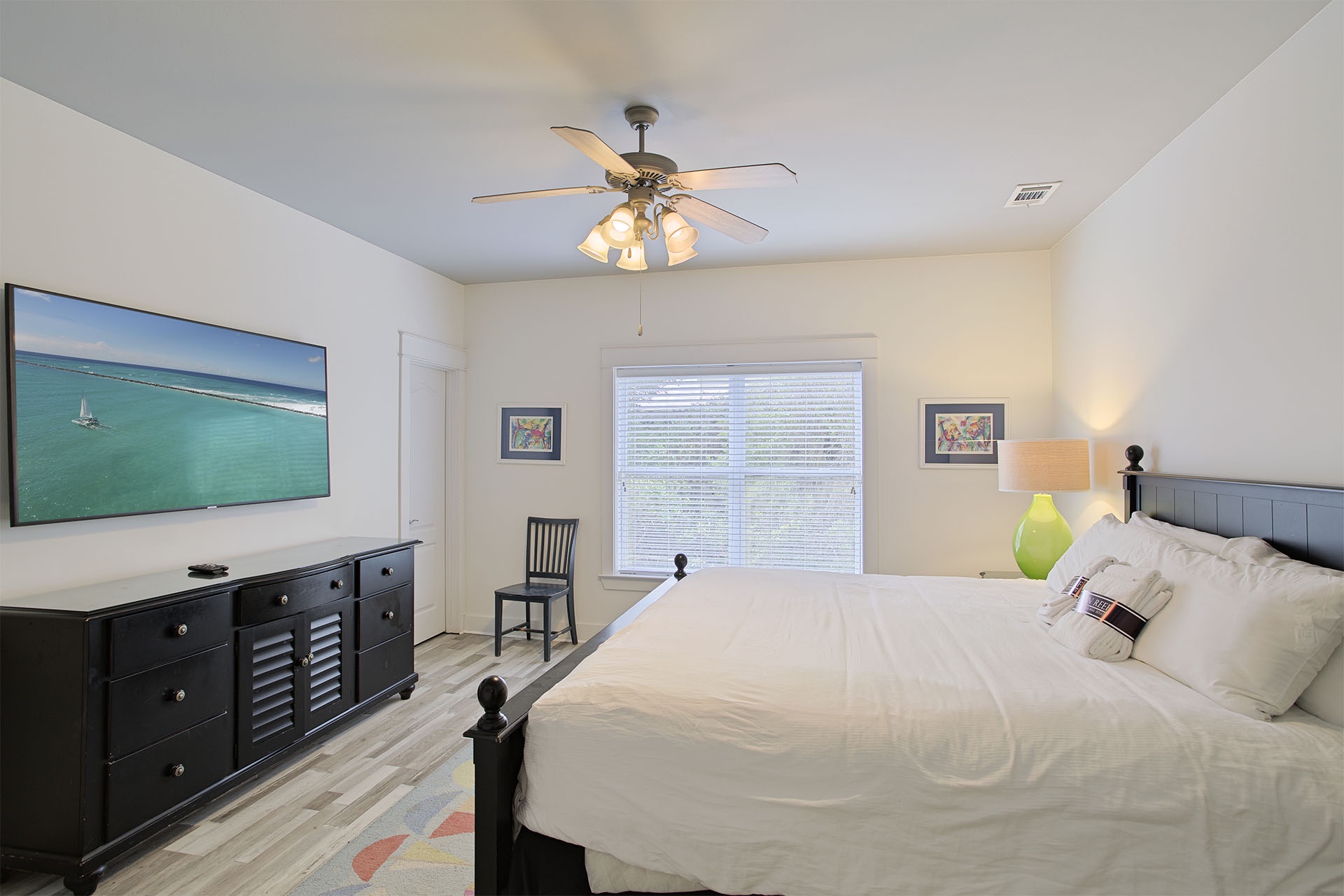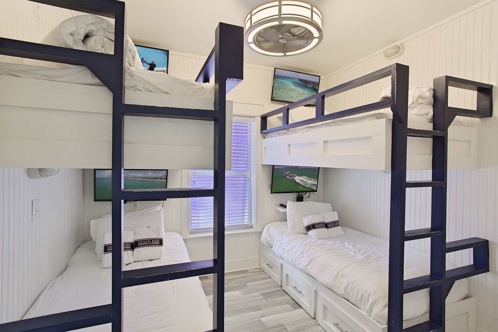 The first floor encompasses three Guest Bedrooms, the Dining Room, and a contemporary open kitchen. Stainless steel appliances in the spacious kitchen enable the cooks to create a fun family seafood feast easily. A dark, gleaming solid surface countertop wraps around to include a bar with four raised seats for enjoying convivial visits with favorite tropical beverages and munchies. The separate dining area has a long white tabletop surrounded by navy blue chairs - providing a crisp, distinctive nautical ambiance. Three of the six bedrooms are located on the first floor, including one with a king-sized bed (and a 65" Flat Screen TV) and one with a queen bed. Each has access to a full bathroom, and the third bedroom has twin bunks with four colorful berths, which of course, provide perfect quarters for the kids. The bunk room also features a TV for each bed with easy HDMI hook-ups (don't forget game consoles). Also, it should be noted that all of these rooms have the easiest access to the gracious courtyard pool and patio.